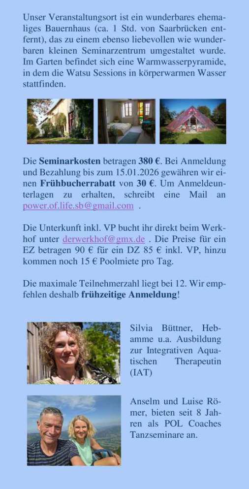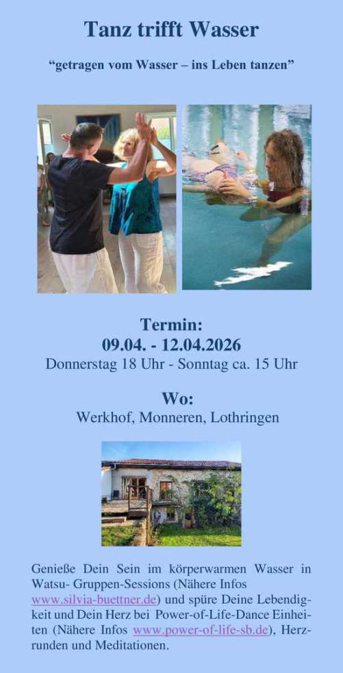 In 2026 bieten wir wieder gemeinsam mit Silvia Büttner (u.a. Ausbildung zur Integrativen Aquatischen Therapeutin) das Intensivseminar "Tanz trifft Wasser" dieses Mal 3, 5 tägig vom 09.04. -12.04. auf dem Werkhof in Monneren. Das Seminar ist ab sofort buchbar. Weitere Details findest du im Flyer unten.