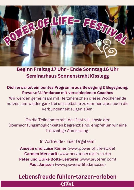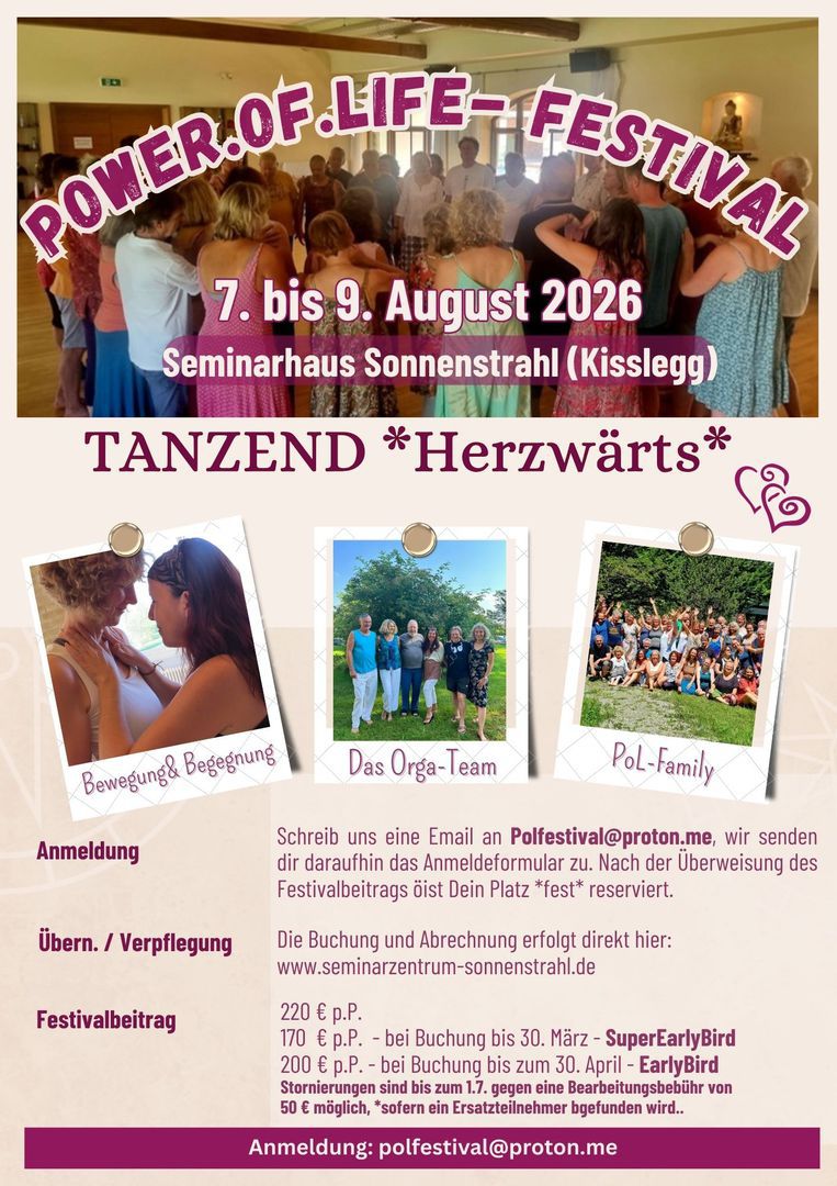 Unser 8. POL Festival vom 07.-09-08. 2026 bietet wieder fröhliche , berührende und inspirierende Begegnung mit lieben Herzensmenschen . Deswegen ist unser Motto auch "Tanzend herzwärts" . Das Festival ist ab sofort buchbar. Auch in diesem Jahr übernimmt Ulrike die Anmeldungen. Schicke ihr einfach eine Mail an :